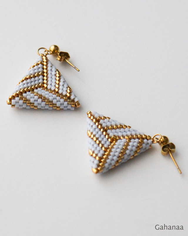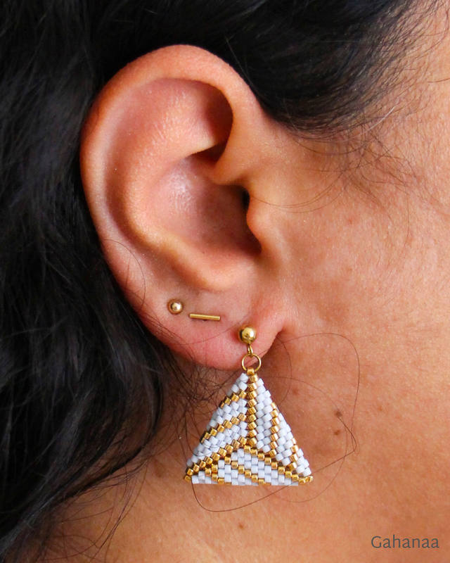 Les boucles d'oreille *Mathilde* sont des pendants d'oreille. Leur forme triangulaire et leur couleur bleu clair leur permet d'apporter une touche de fantaisie à une tenue qui peut être par ailleurs très sobre. La note dorée les rend adaptées à une tenue casual ou plus chic.